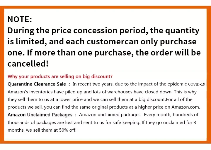 Why Are Your Products So Discounted? Full Liquidation: In The Past Two Years, Due To The Impact of The COVID-19 Epidemic, Amazon Has Overstocked and A Large Number Of Warehouses Have Been Closed. This Is Why They Are Sold To Us At A Lower Price, and We Can Sell Them At A Great Discount.